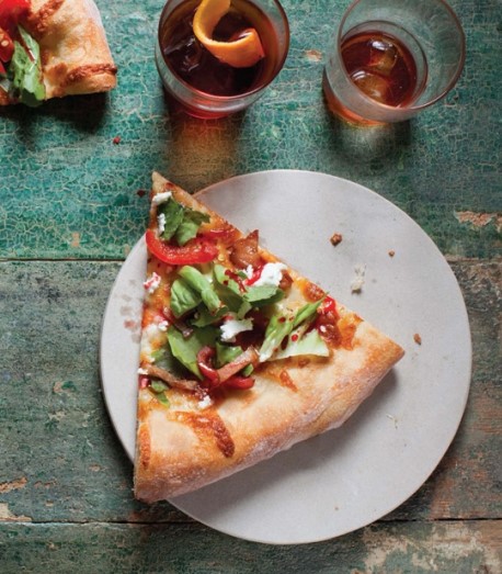 6. Top the baked pizza with red pepper flakes, crumbled goat cheese, escarole, Peppadew peppers, and drizzle with Campari syrup and olive oil.