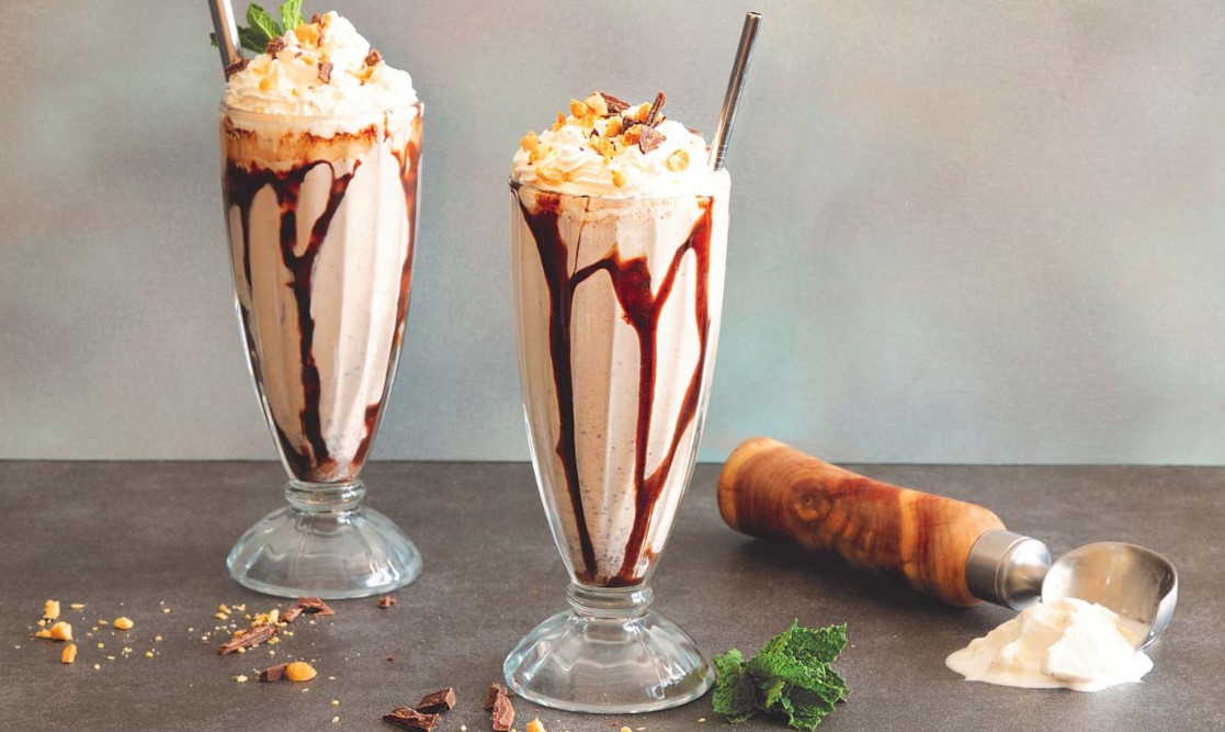 This milkshake is for true chocolate lovers—three types of chocolate combine to deliver a sinfully sweet dessert. INGREDIENTS | SERVES 2 4 scoops Double Brownie