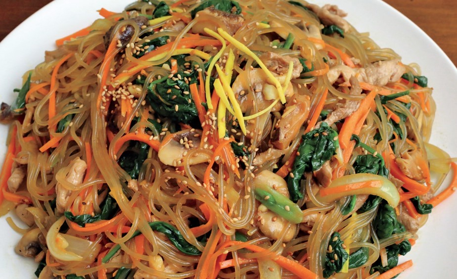 This dish of clear sweet potato noodles (which are very similar to cellophane or glass noodles), stir-fried vegetables, and beef is more than the sum