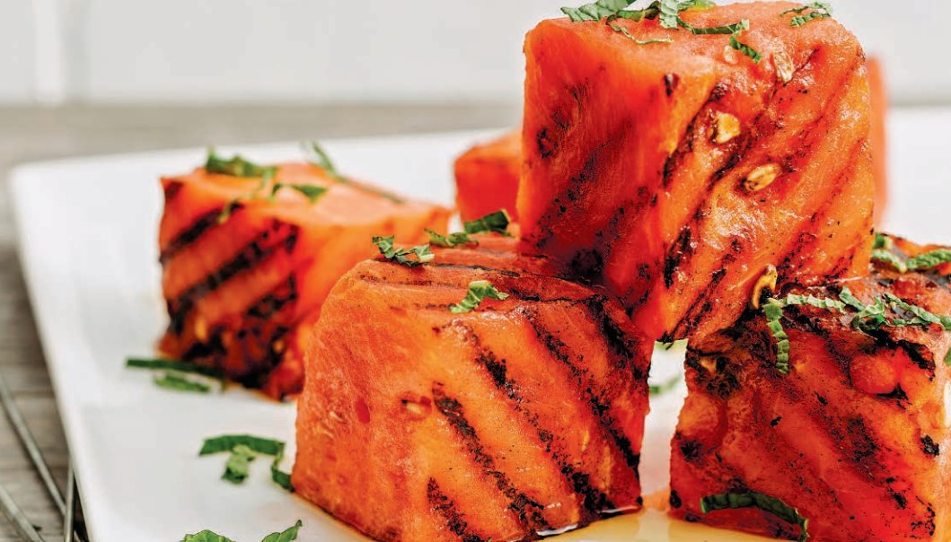 These watermelon kebabs are grilled hot and fast and then drizzled with a light mint syrup and garnished with fresh mint. They are a refreshing