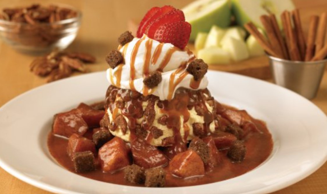 Roll a scoop of creamy vanilla ice cream in homemade candied pecans. Surround the ice cream with warm cinnamon apples and drizzle caramel over the