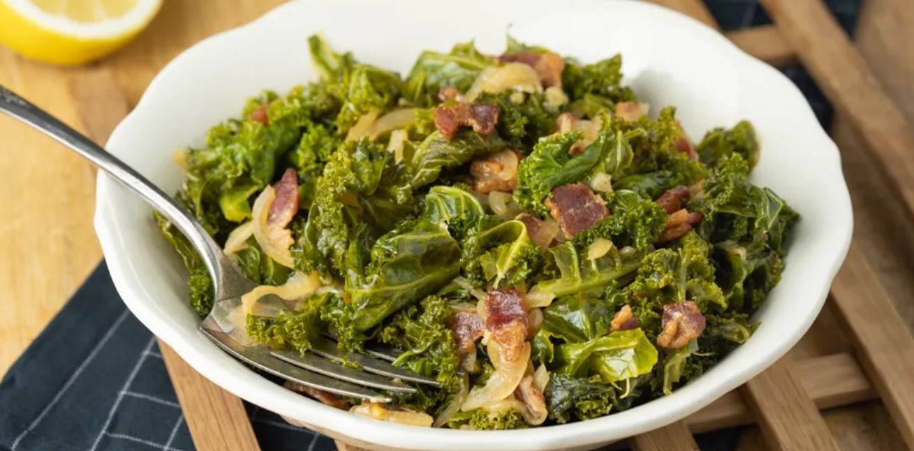 Sweet and smoky, this dish is not only scrumptious but good for you, too! Kale is delicious when braised until tender and flavored with bacon