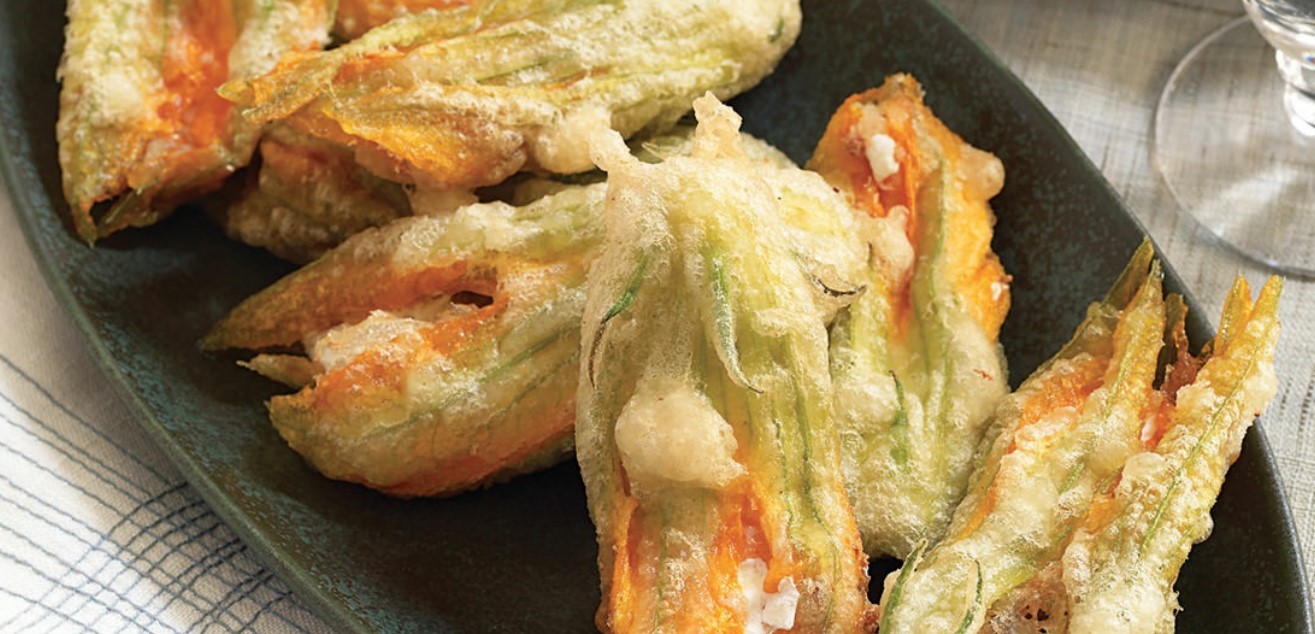 For this little appetizer, which is sensational with a glass of chilled Prosecco, zucchini flowers are stuffed with a bit of anchovy and mozzarella, coated