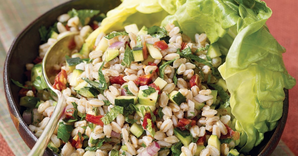Combined with zucchini and sun-dried tomatoes, farro makes a delicious salad— something a little different for a summer barbecue or a picnic. If farro is