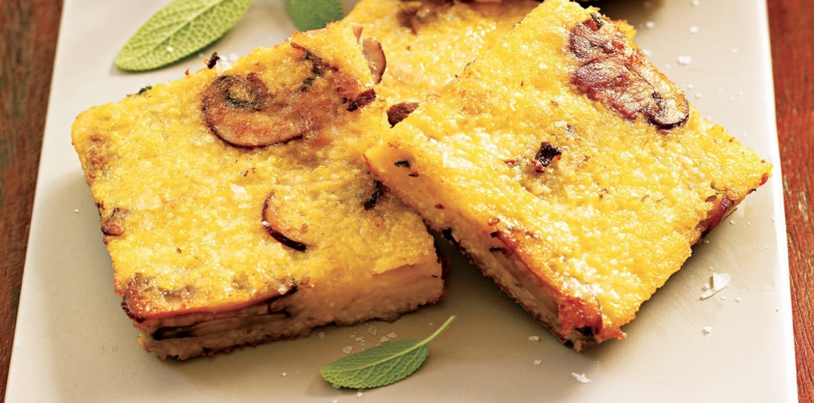 Crisp squares of golden polenta studded with mushrooms are crunchy on the outside and creamy within, just right with a glass of Barbera, a local