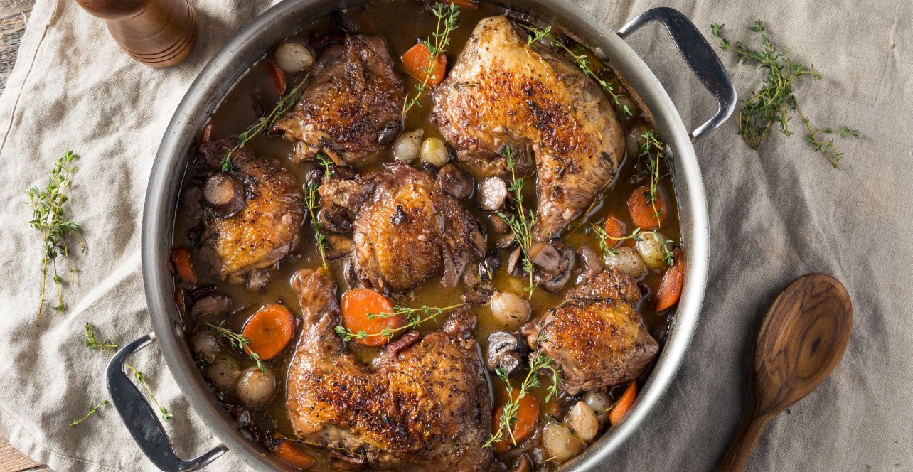 Experience the rich and comforting flavors of Coq au Vin from Burgundy, a classic French dish that embodies the essence of rustic elegance. Tender chicken