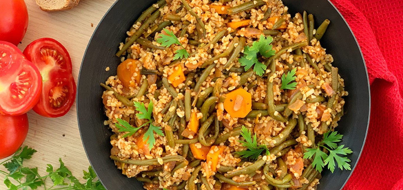 Tender-yet-crunchy green beans make every bite of this bulgur dish delectable. It’s a simple, almost rustic dish, and it is a wonderful side for baked