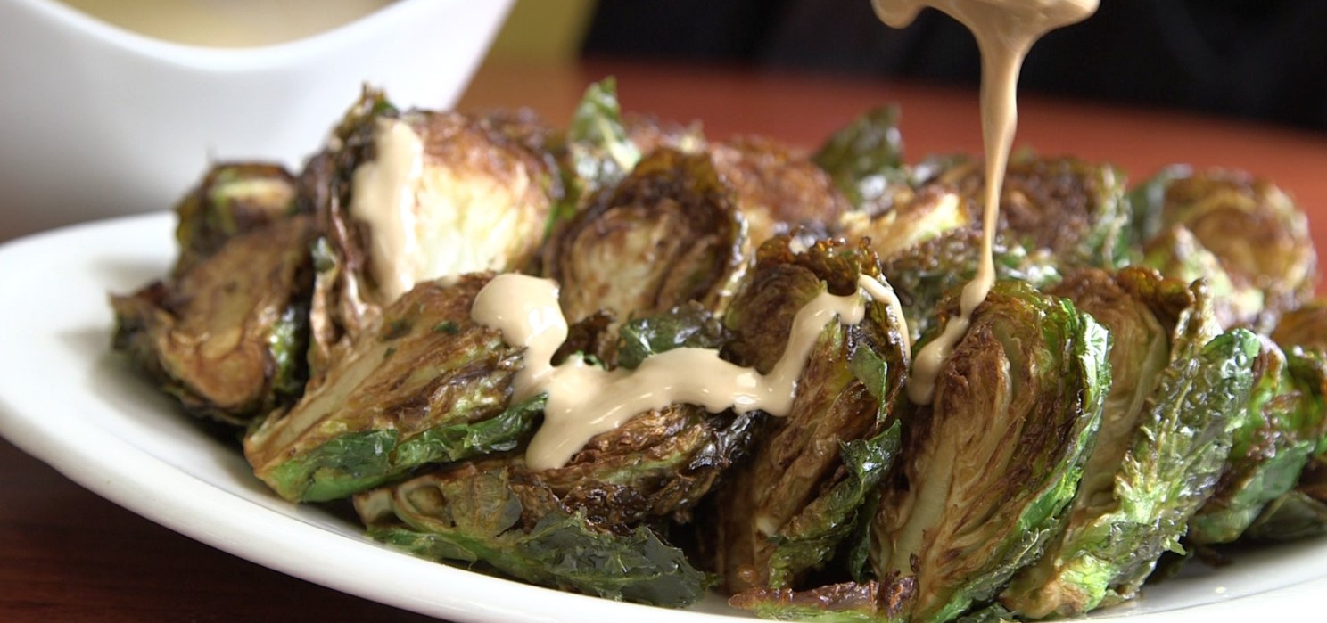 Brussels sprouts and kamut come together in this delightful and nutritious dish, topped with a tangy tahini dressing and sprinkled with za’atar for a Middle