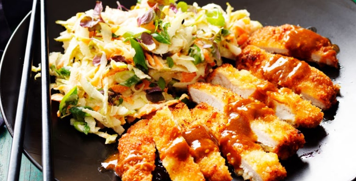 Experience a delightful harmony of flavors and textures with this exquisite Katsu Pork dish, complemented by a refreshing Pear & Carrot Slaw. Heart-smart pork loin