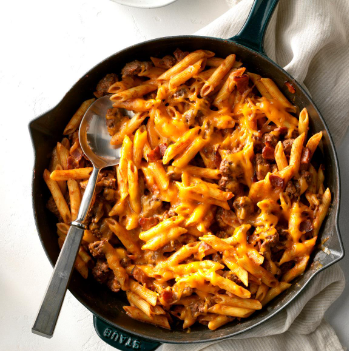 Get ready for a delicious twist on a classic burger in the form of a pasta bake. This prep-free casserole combines the flavors of a juicy burger with macaroni, creating a hearty and satisfying dish that the whole family will love. We added ground beef, pickles, American cheese, bacon, and chopped onion to the macaroni, infusing it with the tangy and meaty flavors we crave. A smooth tomato sauce serves as the base, seasoned with Worcestershire sauce and dry mustard for an extra kick. The combination of dill pickles and brown sugar gives the sauce a sweet and pungent flavor reminiscent of pickle relish, adding a delightful crunch to each bite. With slices of creamy American cheese, crispy bacon, and a sprinkle of onion as the final toppings, this pasta bake truly captures the essence of a burger. Just be sure to crumble the beef into small pieces to ensure even cooking.