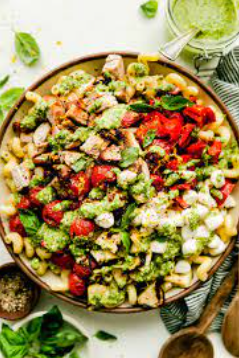 Savor the delightful flavors of this scaled-down pesto pasta salad, where the essence of fresh basil, olive oil, Parmesan, lemon juice, shallot, and garlic meld