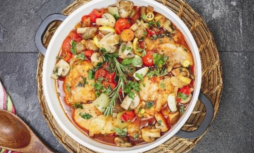 The addition of red wine infuses the chicken with a touch of acidity and richness, further enhancing the flavor profile. A blend of herbs, including dry oregano, dry thyme, and a sprig of fresh rosemary, brings a fragrant and aromatic element to the dish. Fresh parsley adds a pop of freshness and color as a finishing touch.