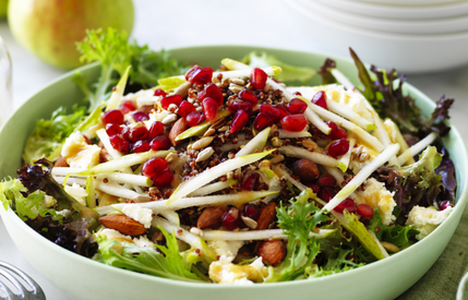 - In a large mixing bowl, combine the sliced pears, cooked quinoa, toasted seeds, crumbled marinated feta, pomegranate seeds, and mixed leaves.