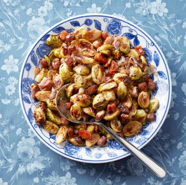 - Carefully turn over the pork belly cubes and Brussels sprouts, ensuring an even cook on all sides.
