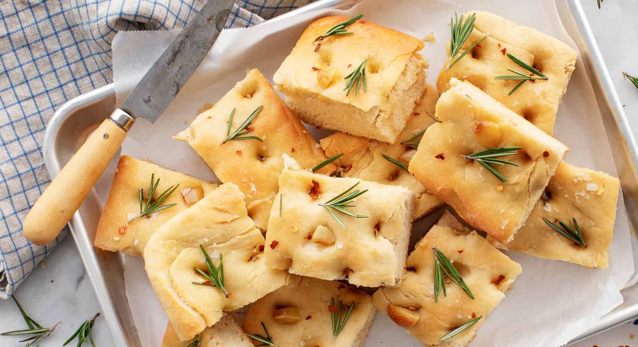 5. Cut the focaccia into squares and serve with meals or as a snack. Alternatively, cut the squares in half horizontally to make sandwiches. If desired, the focaccia can be frozen by wrapping it first in plastic and then in foil. To reheat, unwrap and remove the plastic, then wrap in foil and heat in a 350°F (175°C) oven for 10 to 15 minutes.