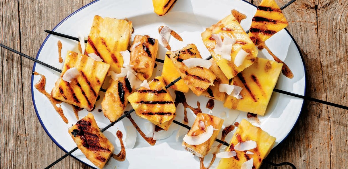 - Once the fruit is properly marked, promptly remove the kebabs from the grill and place onto a platter. Drizzle with warm Rum Sauce, garnish the kebabs with toasted coconut flakes, and serve.