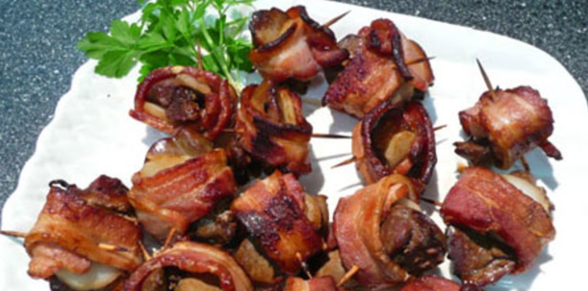 4. Wrap and Secure: Take one piece of chicken liver and one slice of water chestnut from the marinating mixture and wrap them together in a half slice of turkey bacon. Secure the wrap with a toothpick.