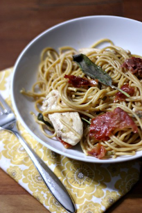 For a deconstructed chicken saltimbocca,we kept the key elements in place—crisp prosciutto, browned chicken, and fried sage—but changed things up a bit. First, saving the fried prosciutto and sage for a garnish, rather than layering them on the chicken, ensured a dish permeated with meaty crunch and woodsy sweetness. Slicing the chicken breasts into strips, instead of leaving them whole, promised more bites of tender chicken throughout; browning the strips in the rendered fat left behind from the prosciutto gave the chicken rich, meaty flavor. Building our sauce in the pan with plenty of chicken broth, water, and wine provided enough volume to cook our pasta. At the end, our saltimbocca spaghetti was flavored through and through with the rich, savory notes of sage, prosciutto, and chicken. Fresh sage is important to the flavor of this dish; do not substitute dried sage.
