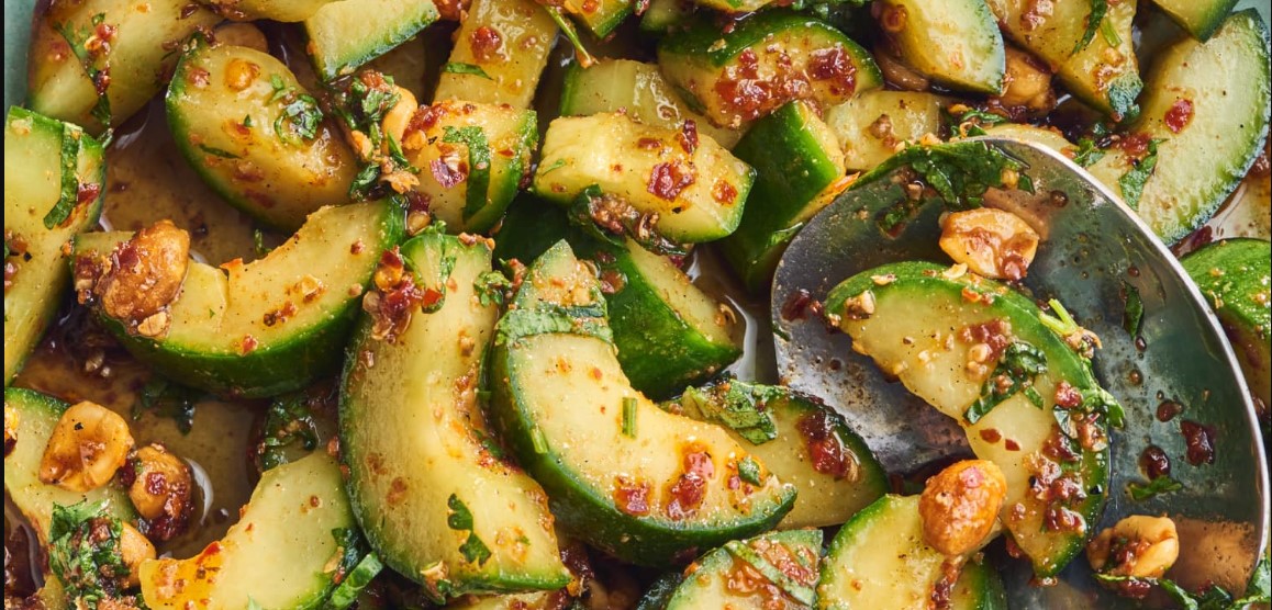 - Cut each cucumber crosswise into 3 equal lengths and place in zipper lock bag. Seal bag. Using small skillet or rolling pin, firmly but gently smash cucumbers until flattened and split lengthwise into 3 to 4 spears each. Tear spears into rough 1-inch pieces and transfer to colander set in large bowl. Toss cucumbers with salt and let sit for at least 15 minutes and up to 30 minutes.