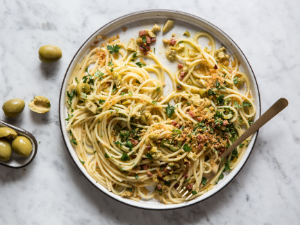 Spaghetti with Greens, Beans, Pancetta, and Garlic Bread Crumbs