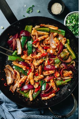 - Heat a deep large skillet or wok over high heat. Add the vegetable oil and the onion, and stir-fry for 1 to 2 minutes.